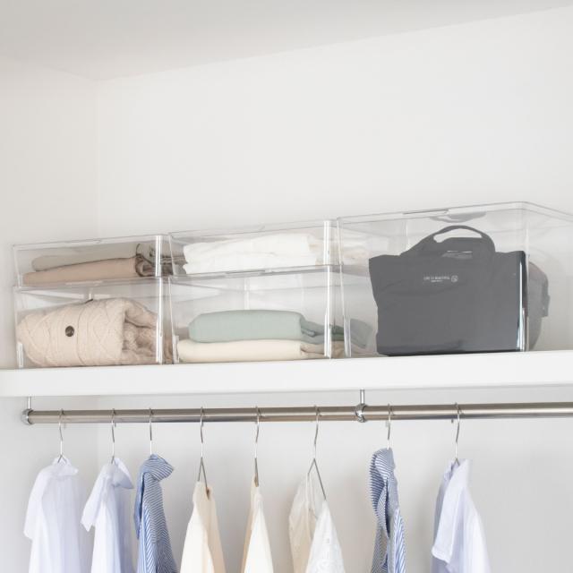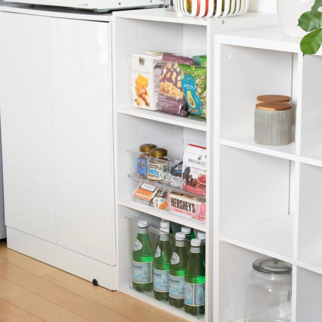 スケルトンボックスシリーズはカラーボックスや棚にもスッキリ収まる、使い勝手の良いサイズ設計。キッチンのパントリー収納や洗面所でタオルの収納、クローゼットで衣類やバッグの収納など、家中のあらゆるモノの収納に役立ちます。