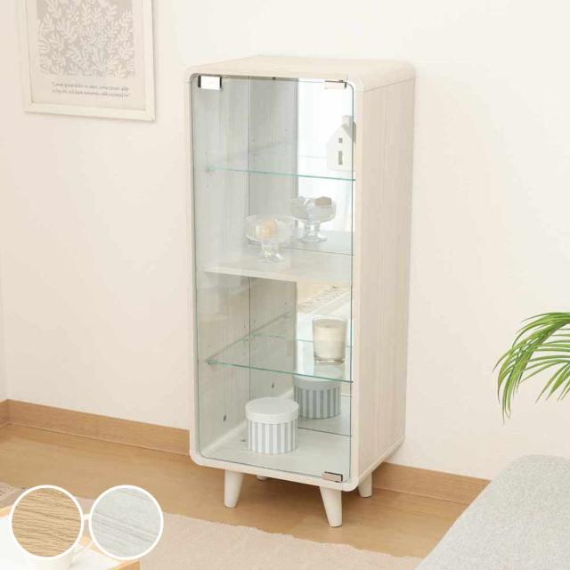 丸みのある木目調のフォルムにクリアガラスを組み合わせた、上品なコレクションシェルフです。透明なガラス扉が中のアイテムを美しく惹き立てるため、リビングで雑貨や小物を飾ったり、趣味のお部屋でフィギュアやコレクションを並べたりと、多彩なシーンでお使いいただけます。