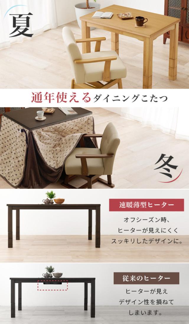 まとめて揃えられる3点セット テーブルサイズ 90cm×60cmデザイン性が高く、ヒーターが薄く見えにくい設計です。オフシーズン時に、こたつ布団を外した状態で横から見ても、ヒーターが見えにくくスッキリとしています。テーブル1台で夏も冬も快適に過ごせるのが嬉しいポイント。サイズ展開も豊富で、生活スタイルに合わせてお選びいただけます