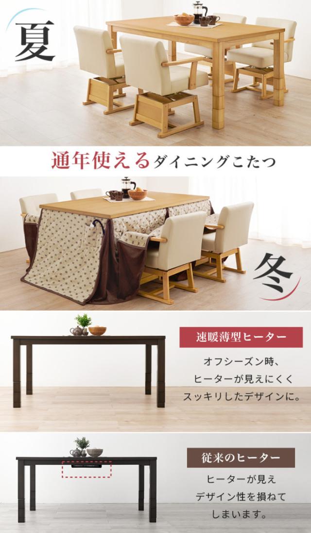まとめて揃えられる6点セット テーブルサイズ 135cm×80cmデザイン性が高く、ヒーターが薄く見えにくい設計です。オフシーズン時に、こたつ布団を外した状態で横から見ても、ヒーターが見えにくくスッキリとしています。テーブル1台で夏も冬も快適に過ごせるのが嬉しいポイント。サイズ展開も豊富で、生活スタイルに合わせてお選びいただけます