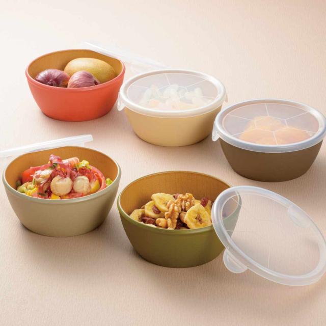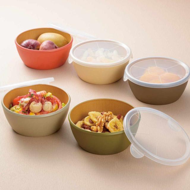 ボウル earth color ラップフリーボウル 5個入 ( BPAフリー 日本製 抗菌 電子レンジ対応 食洗機対応 ふた付き 保存容器 おしゃれ かわいい 軽い 割れにくい つくり置き 抗菌加工 アースカラー 木目調 )