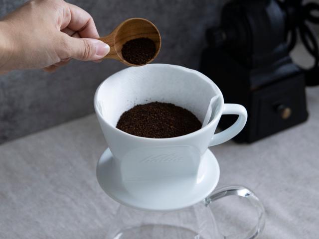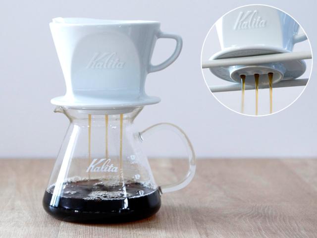 抽き出したコーヒーをドリッパー内にためずに、自然に滴下させるカリタ独自の三つ穴構造のドリッパー。雑味が出る前に美味しさだけをドリップできます。