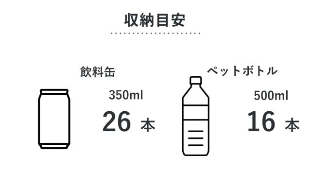 | 備考 | 収納目安:350ml缶×約26本、500mlペットボトル×約16本 |
