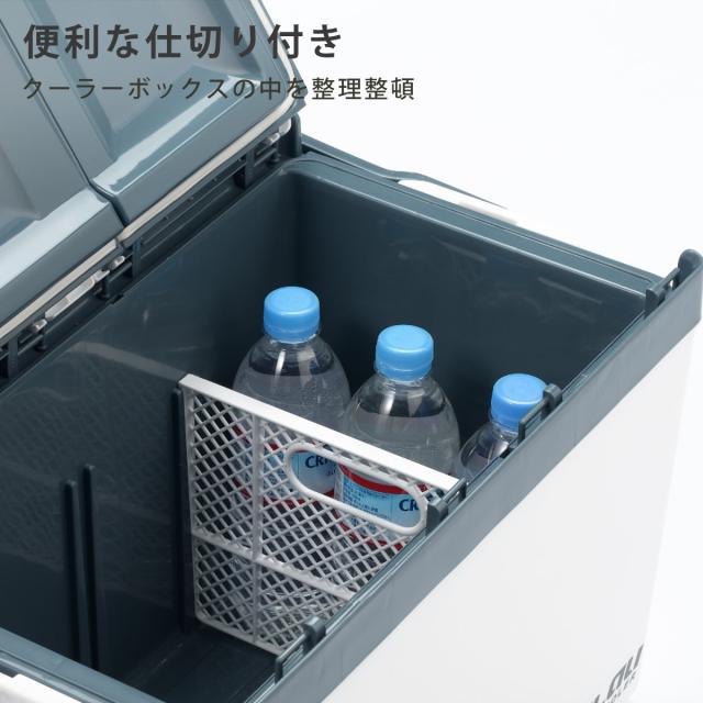 仕切りが付いているので、飲み物と食べ物を分けたり、クーラーボックスの中を整理するのに役立ちます。移動中も収納物の転倒を防ぐことができます。