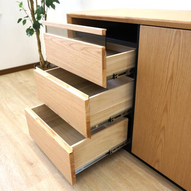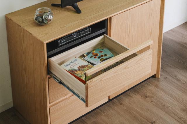 最上段の引出しを開けると上段には棚が。デッキなどのAV機器を収納するのに最適なスペースです。2段目3段目は深さがあり、DVDケースなども収納していただけます。全段ダブルスライドレール仕様なので、奥にしまったものまで手に取りやすく開閉がスムーズです。