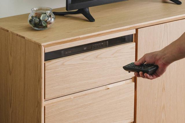 デッキ収納部の前板はガラス仕様なので、扉を閉めたままでもリモコンの操作が可能です。