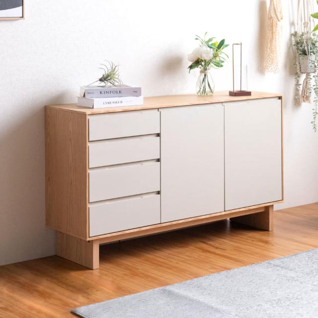 サイドボード 幅140cm 背面化粧 フルスライドレール 天然木 完成品 ( 棚 ラック 引き出し A4対応 収納 可動棚 ニュアンス くすみカラー リビングボード 4段 省スペース ツートンカラー お掃除ロボット対応 )