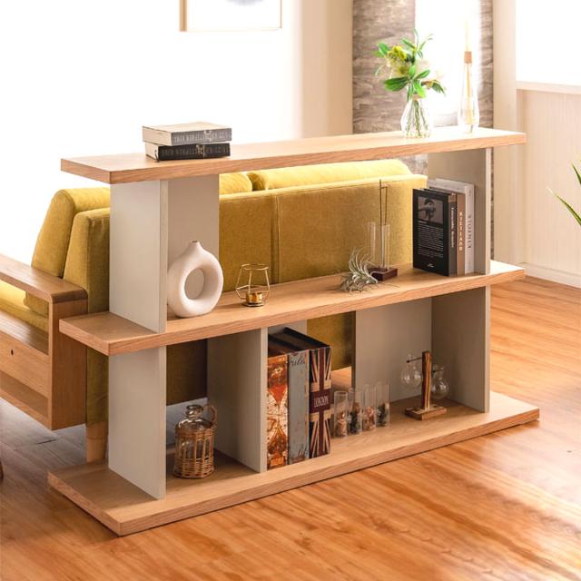 環境に配慮したFSC認証を取得した天然木工芸突板を使用したオープンシェルフです。ナチュラルなフレームとグレージュのツートンカラーが、空間に明るさと優しさをプラスします。ソファの後ろや壁付け、お部屋の間仕切りとして、3wayでお使いいただけます。
