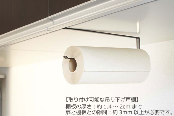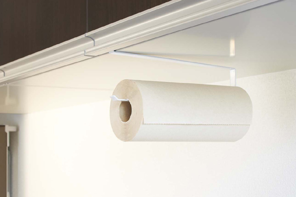 すぐに使いたいキッチンペーパを手が届く位置にすっきり収納できます。今まで何も無かった戸棚下が「収納」へと変わります。