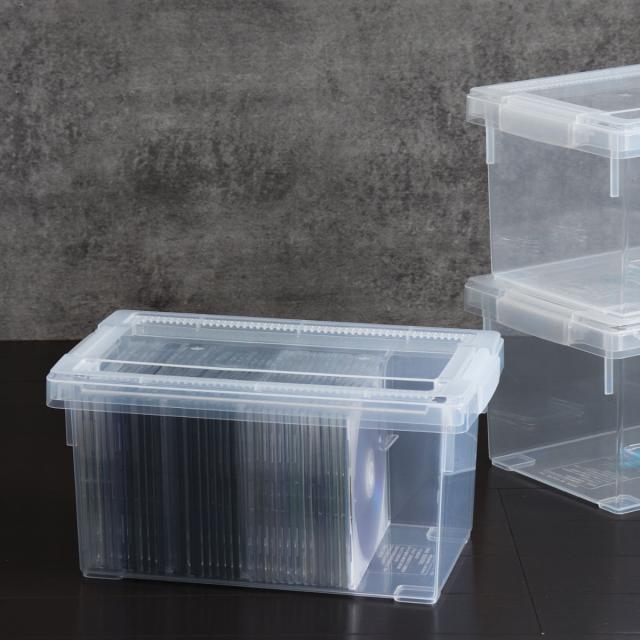 フタをしていても中身が見えるオールクリアタイプなので、収納されているものが一目で確認できます。ケースに収納したままでも側面から背表紙が見えるので、積み重ねていても探しやすいです。