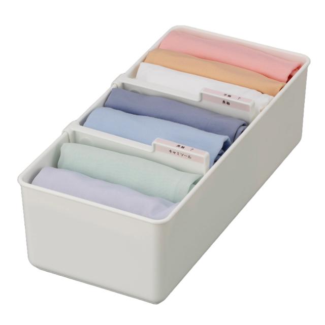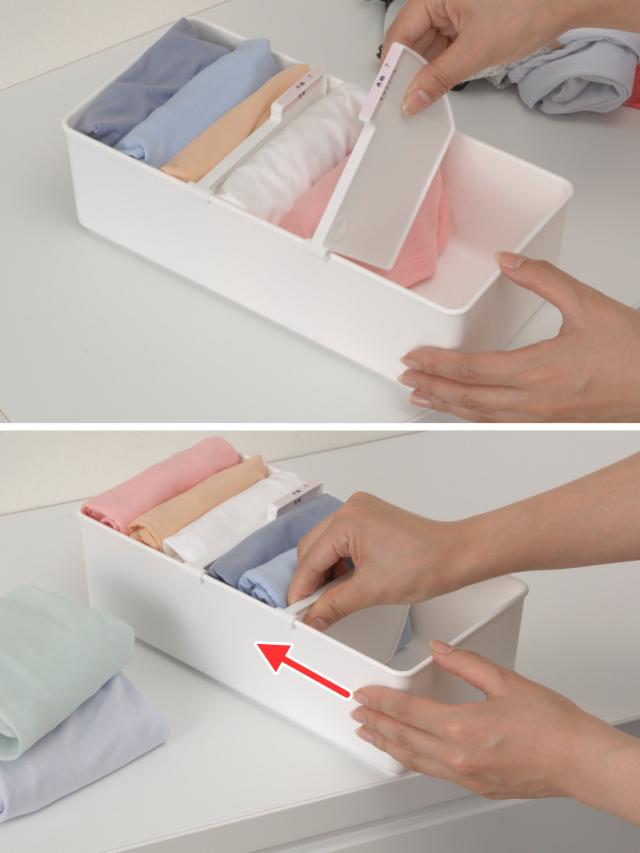 種類や量に合わせて仕切りを前後にスライドすることが出来ます。取り出した後も残りの衣類が倒れて積み重なるということがなく、いつでも綺麗な収納を保てます。