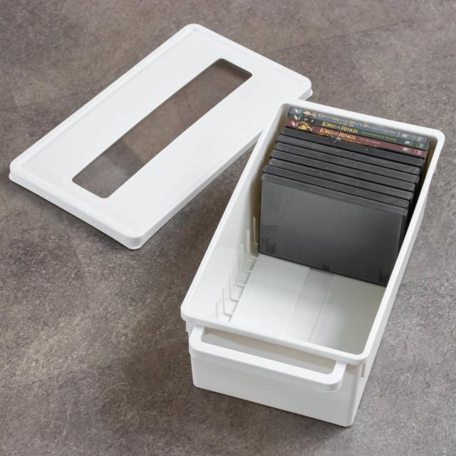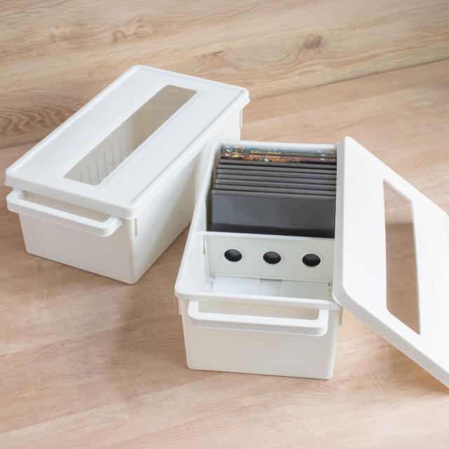 大切なDVDやゲームソフト、コミックをたっぷり収納できるメディアコンテナです。フタが付いているので、収納物をホコリや傷から守り、キレイに保管しておけます。透け感のない素材のため中が見えず、目につく場所に置いても自然とインテリアに溶け込みます。