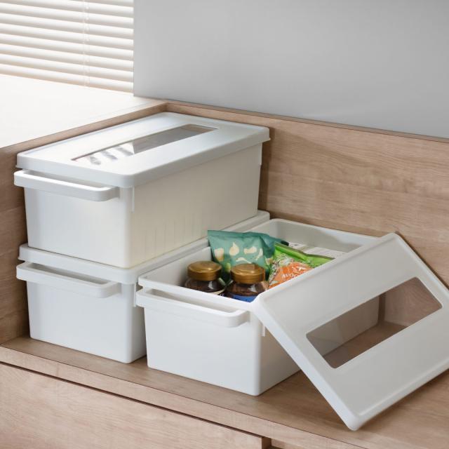 フタ付の収納ケースは、キッチンで食料品や調味料を入れたり、洗面所でスキンケアや歯ブラシのストックを入れたりと、日用品を整理するのにも便利です。また、サイズ違いの「CDケース」と組み合わせると収納の幅がさらに広がり、さまざまなシーンで活用できます。