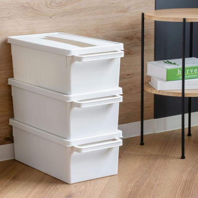 ベッド下や棚に収まるコンパクトな設計で、限られたスペースにもスマートに収納が可能です。積み重ねることもできるので、クローゼットやリビングのすき間にも収まります。持ち手を使って、ラクに出し入れや持ち運びができるのも嬉しいポイントです。