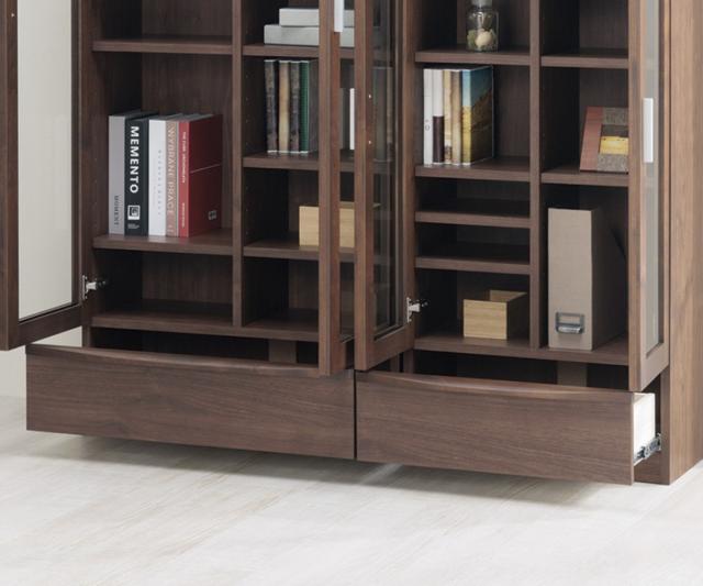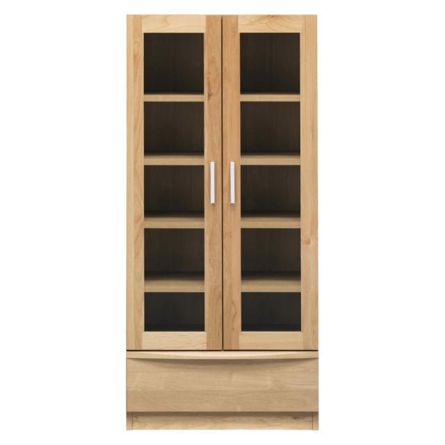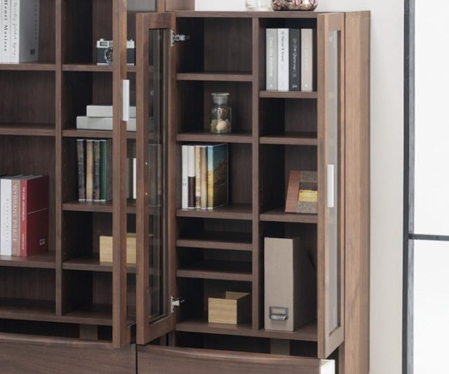 美しい木肌が特長のアルダー材を使用したガラス扉の本棚です。ガラス扉は、大切な書籍や趣味のコレクションなどをホコリから守ります。アルダー材は経年変化を楽しめ、長くお使いいただけます。