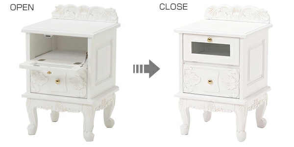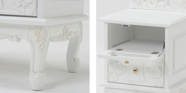 | エレガントな装飾と猫脚 細部まで惜しみなく施された浮彫りのデザインは、職人が一つ一つ丁寧に仕上げています。猫脚は先がコロンと丸く愛着のある形です。 | フラップ扉と引出し フラップ扉の下段には気品漂う引き出しが。小物やコスメの収納庫としてお使いいただけます。 |