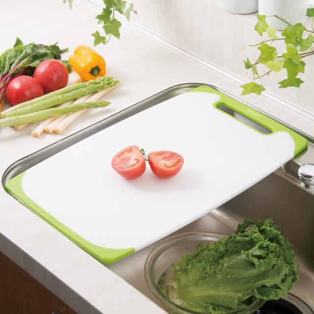ゆとりをもって使える大きめサイズで、シンクに渡してお使い頂いても便利です。両面使用可能なので、食材によって使い分けできて便利です。