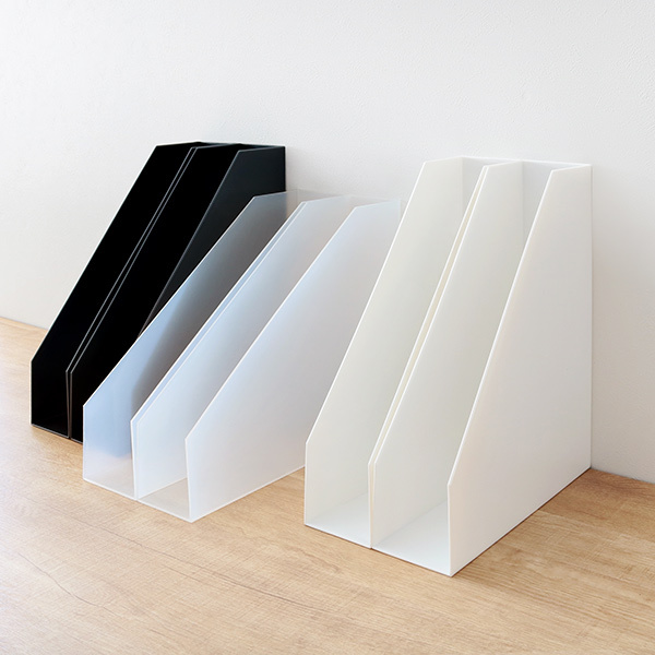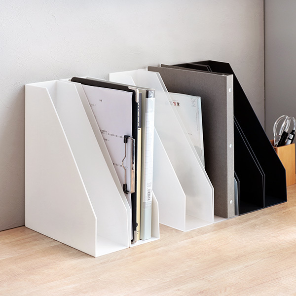 書類やファイルを整理するのに最適なファイルボックスです。デスクの上に置くと、必要な書類をサッと取り出せます。複数置いて、種類別に書類を仕分けるのもオススメです。オープンカット仕様なので、収納物のサイズを気にすることなく収納できます。