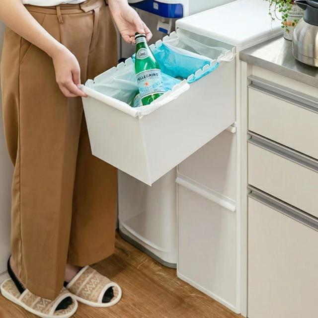 左右に並んだ切り込みフックに掛けるだけで、ポリ袋を簡単に装着・取り外しができます。奥行きを利用して1段で複数の分別が可能です。種類別にゴミ箱を用意しなくても、これ1台ですっきりと収まります。