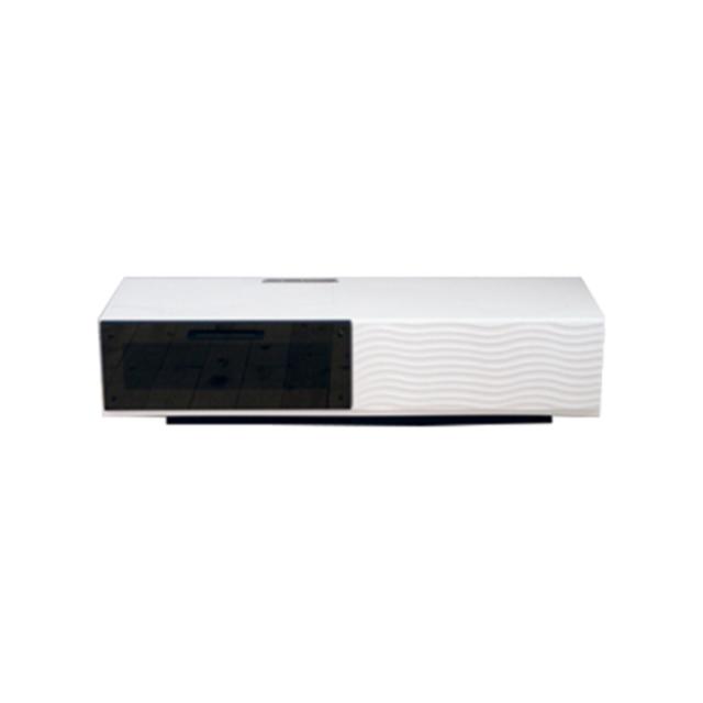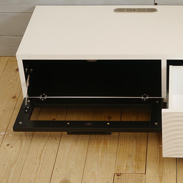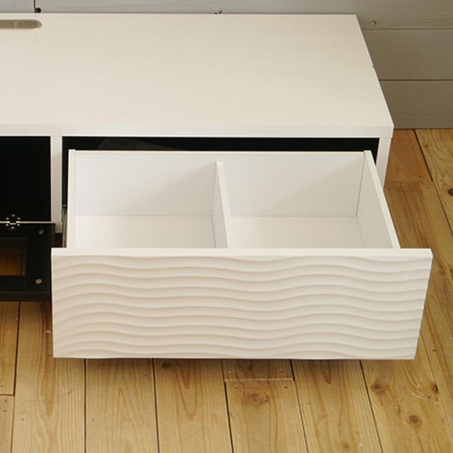 空間を引き締めるモノトーンデザインのテレビ台です。シンプルなフォルムに、引き出し前板の立体的な波状デザインがアクセントとなり、表情をプラスします。