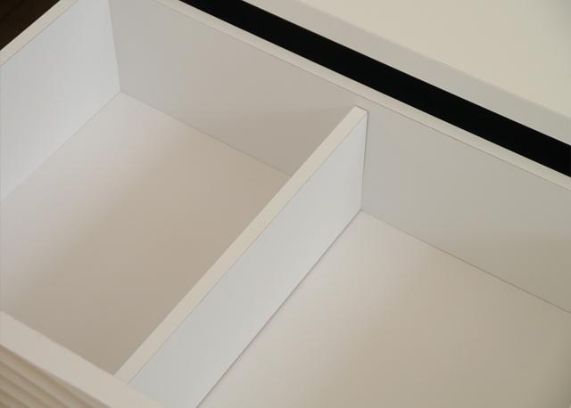 引き出しにはフルスライドレールを採用しているため、奥までしっかり引き出せて使いやすいです。内部は仕切り板が付いています。