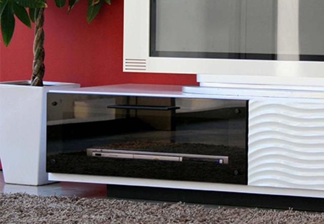 前面に倒れるフラップタイプの扉で、物の出し入れがしやすいです。ガラスは赤外線が透過するので、扉を開けずにAV機器やゲーム機などのリモコン操作ができます。