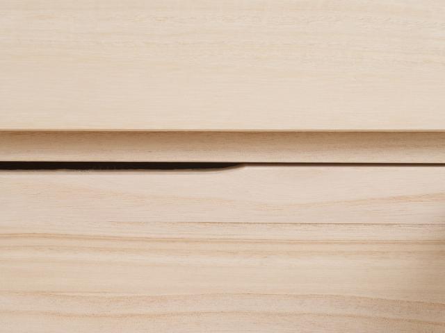 桐チェストは機密性が高いため、引き出しをスムーズに開閉できるように奥板に空気逃がしを施しています。