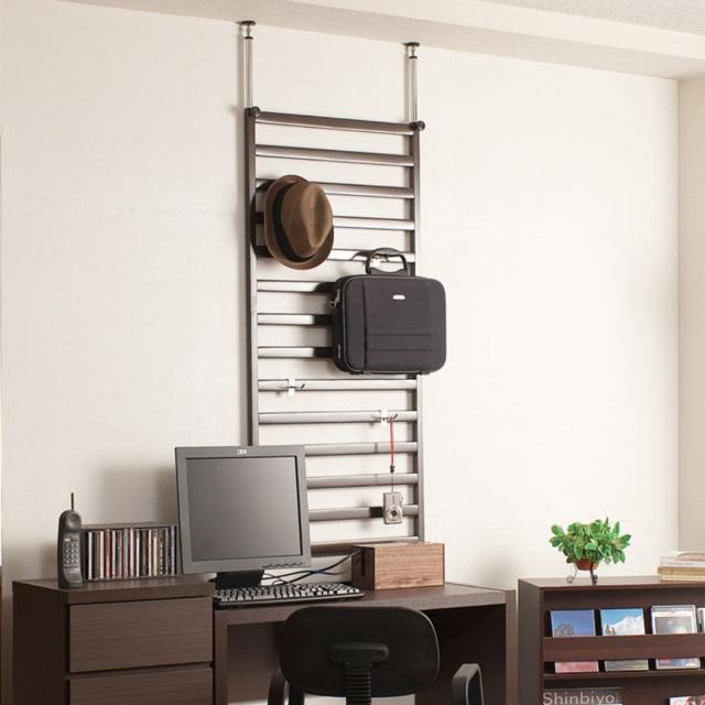 棚やチェストなどの家具の上に設置して、壁面に収納スペースを増やせるラダーラックです。壁を傷付けることなく設置できる突っ張り式で、賃貸住宅にお住まいの方にもおすすめです。奥行がスリムなタイプなので、デスク上に設置しても圧迫感を感じにくいです。