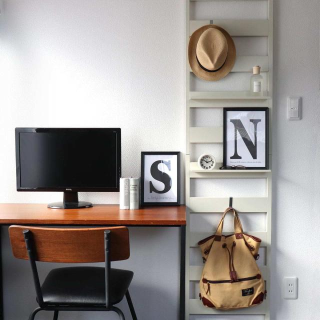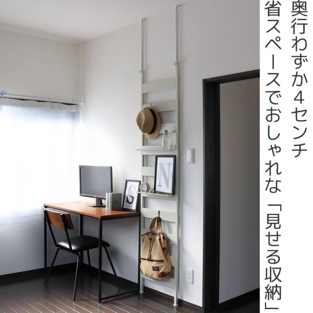 省スペースで設置できるつっぱり式のラダーラックです。「見せる収納」としてディスプレイを楽しみながら収納でき、インテリアのアクセントにもなります。壁に穴を空けないので賃貸やワンルームにもおすすめです。