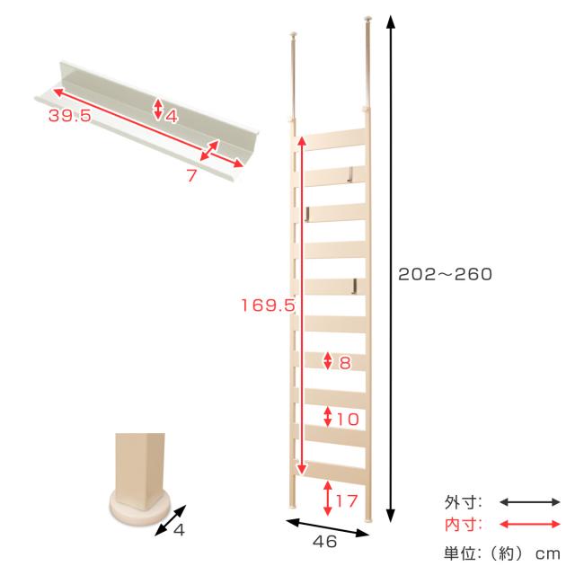| サイズ | 本体(アジャスター含む):約 幅46×奥行4×高さ202〜260(cm) 棚板:約幅39.5×奥行7×高さ4(cm) |