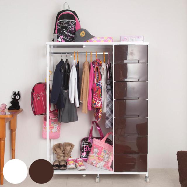 収納ケース ハンガー付きプラスチックチェスト 引き出し 7段 高さ141cm ハンガーラック ( 幅86〜105cm 伸縮 収納 衣類 キャスター付き 収納ボックス 日本製 パイプハンガー 収納棚 衣装ケース 衣類収納 子ども部屋 収納ラック 洋服 )