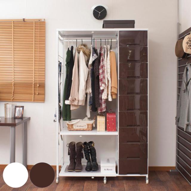 収納ケース ハンガー付きプラスチックチェスト 引き出し 9段 高さ181cm ハンガーラック ( 幅86〜105cm 伸縮 収納 衣類 キャスター付き 収納ボックス 日本製 パイプハンガー 収納棚 衣装ケース 衣類収納 収納ラック 大容量 洋服 )
