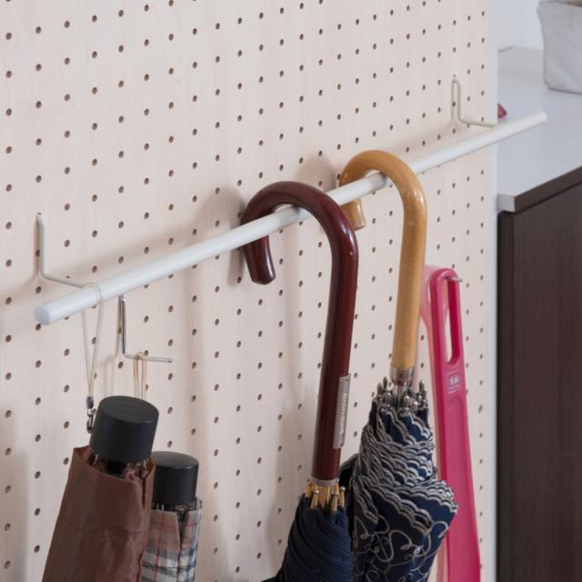 有孔ボード用のハンガーバーは、タオルや洋服、傘など大きめのものもかけやすいです。(掛け幅:約 49cm)