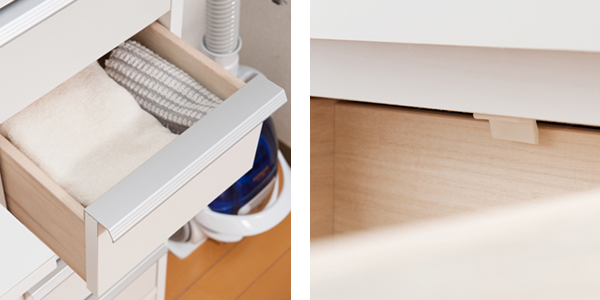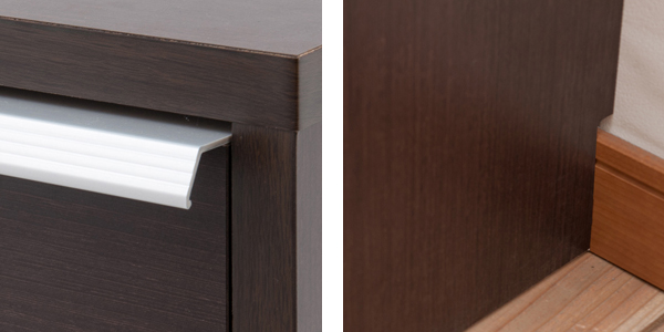 | デザイン性のある取手 アクセントの利いたシルバーの取手が高級感を引き出しています。 | 幅木よけ加工 背面下にL型の切り込みがあるため、壁にぴったりと設置することができます。 |