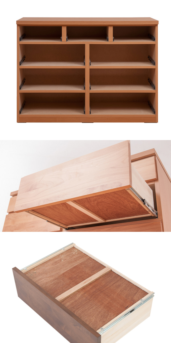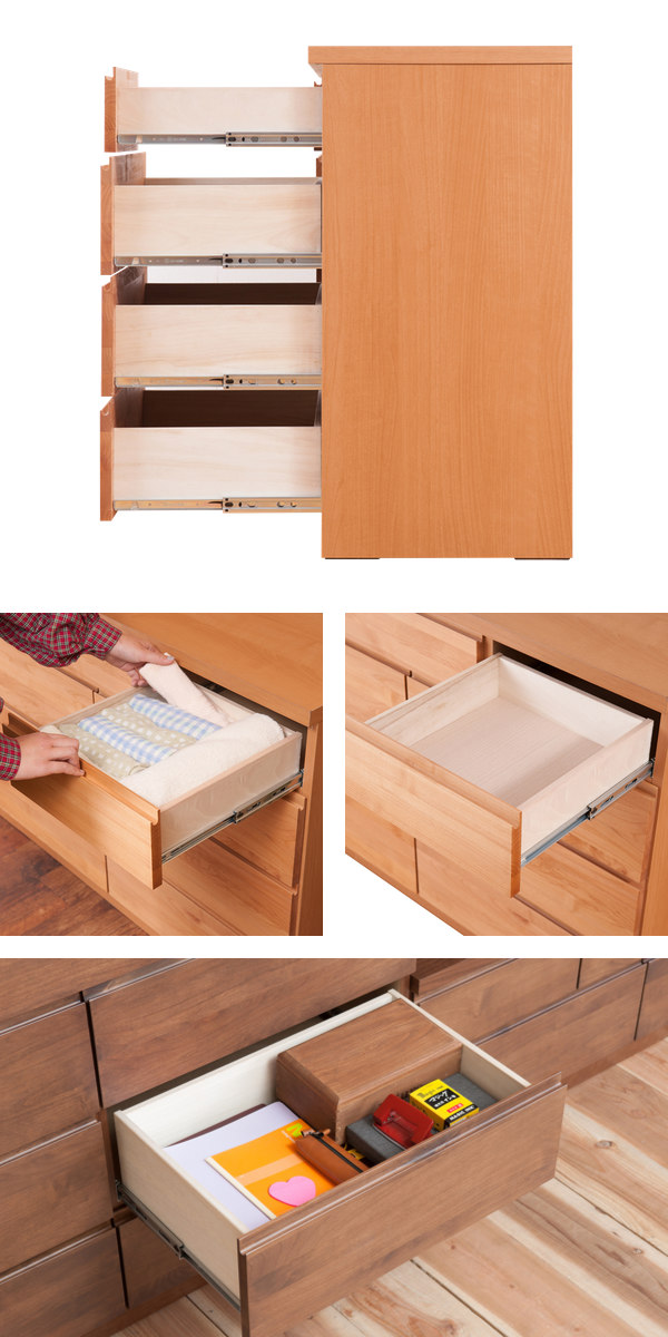 長く使っていただけるように、全段に地板を入れた丈夫な造りです。大きい引出しには強度補強の桟を入れ、重い荷物にも耐えられる様に細部にまでこだわっています。
