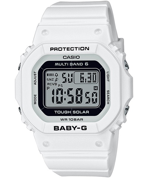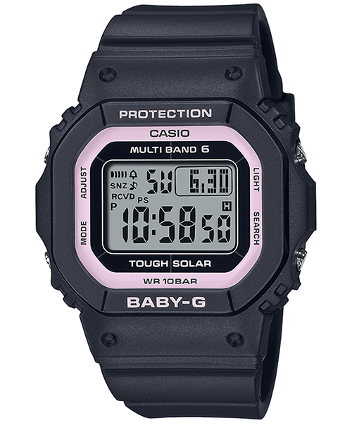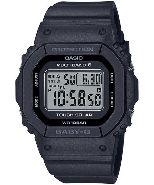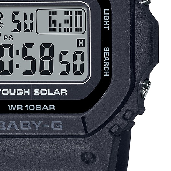 BGD-5650シリーズは従来モデル(BGD-5000)と比較して、ケースサイズで縦方向2.6mm、横方向2.1mmの小型化を実現しました。厚みも1.2mmのスリム化を図ると同時に、より薄く見せるため、ケースをサイドから見てフラットとなるデザインに仕上げました。カラーは様々なコーディネートに取り入れやすいベーシックなカラーリングです。また、機能面では、世界6局の標準電波に対応した電波受信機能やタフソーラーも搭載。更に10気圧防水機能にも対応し実用性も兼ね備えました。季節を問わず幅広いファッションに合わせやすいウオッチです。