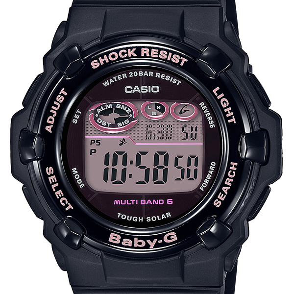 薄型ラウンドフェイスのデジタルモデルです。ブラック×ピンクでコーディネートを華やかに仕上げます。ホーム都市設定を変えるだけで日本国内はもとより、海外でも時刻を自動修正します。機能面では、世界6局の標準電波に対応しタフソーラーも搭載。更に20気圧防水機能にも対応し実用性も兼ね備えました。ワールドタイムやストップウオッチなどの機能も充実。アクティブな女性をサポートするモデルです。