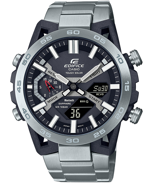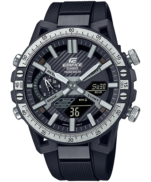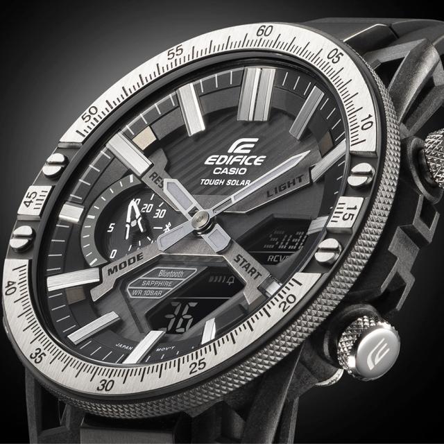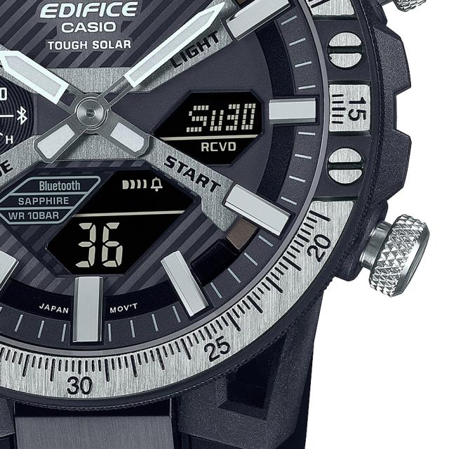Bluetooth®によりスマートフォンアプリと接続し、正確な時刻表示を実現する自動時刻修正、約300都市から簡単に都市選択できるワールドタイム、1/1000秒単位のストップウオッチ計測データのスマートフォン転送、時計ボタンの長押しによりスマートフォンを鳴らす携帯探索機能などを可能にしています。蛍光灯などのわずかな光でも発電するタフソーラーを搭載したサファイアガラスモデルです。