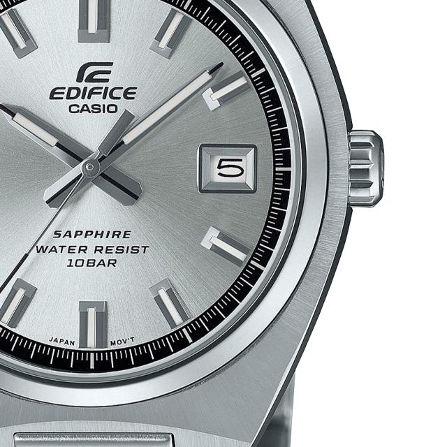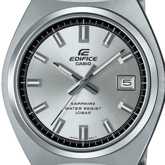 クラシックな印象のラウンド形状のステンレススチールケースとミラー仕上げの細身のベゼルが個性的です。ケースには放射状に筋目が入り硬質感を演出します。EFB-109DJ-1AJFの黒文字板は鮮やかなグロス仕上げに赤い秒針。EFB-109DJ-2AJFと7AJFの青文字板とシルバー文字板は中心から放射状に細かな線が広がるサンレイ仕上げを施しています。