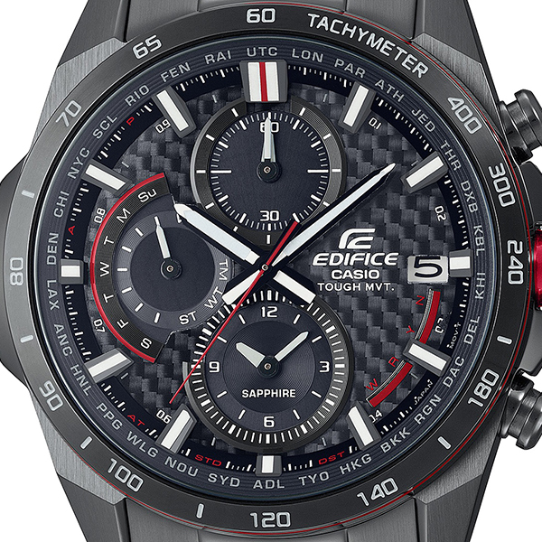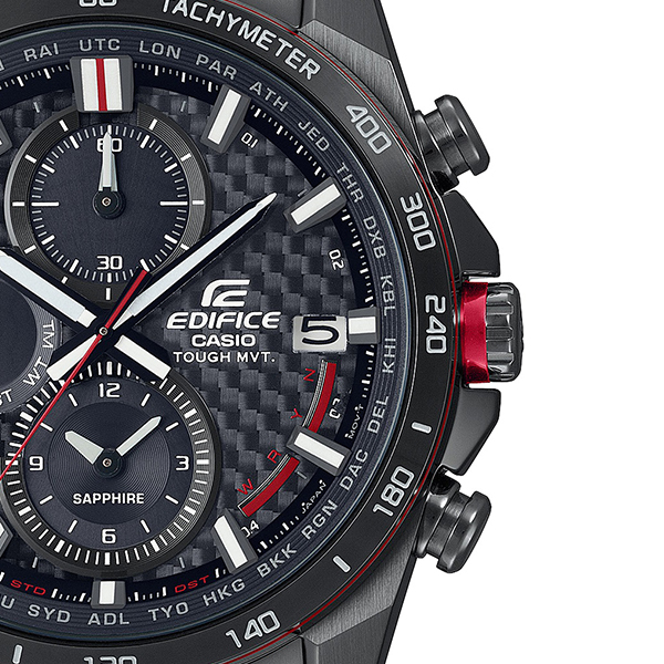 EQW-A2000は3つの小さなインダイアルから光を取り込んでチャージできるため、EDIFICE電波ソーラーシリーズで初めてカーボンファイバー文字板を採用することができ、よりモータースポーツコンセプトに相応しい仕様としました。一度フルチャージすると、多機能にもかかわらず5ヵ月間駆動できるだけのエネルギーを蓄えられるパワフルなソーラーチャージシステムです。