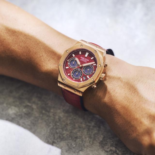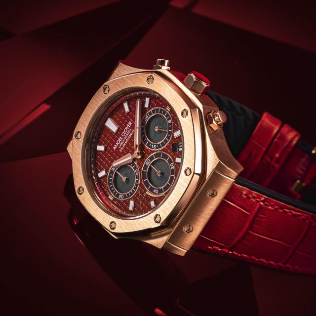 八角形のケースや揃えられたベゼルの鋲など、タフでエッジィかつ高級感のあるデザインが特長です。