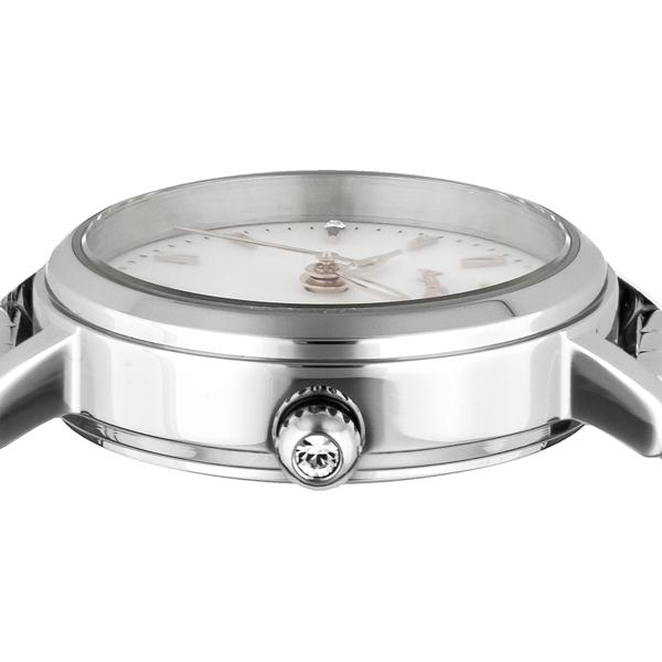 シンプルなデザインでありながら、1秒単位で目盛りが刻まれているため、実用性にも富んでいます。傷がつきにくいサファイアガラスを使用。デザイン性だけでなく、機能面も考えられています。文字盤の天然パールは光の当たり具合で七色に輝き、様々な表情を楽しめます。