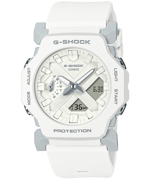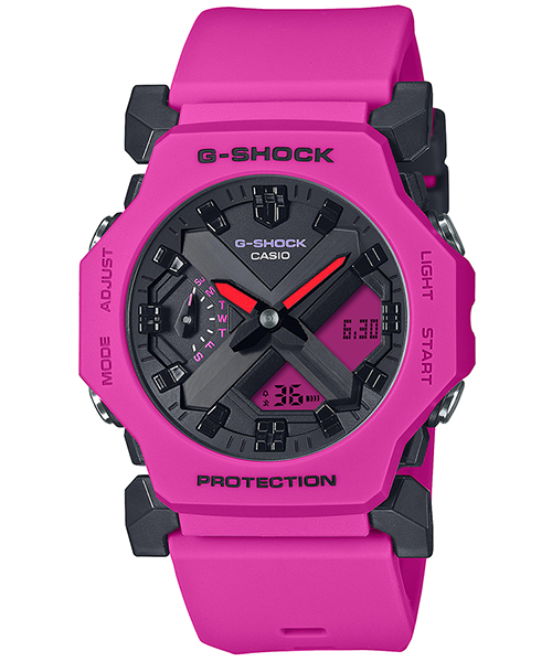 タフネスを時代のニーズに合わせて小型化、薄型化したコンビモデルGA-2300は、無駄をそぎ落としたミニマルなデザインで近未来的なイメージを目指しました。ケース径は45.4×42.1mm、厚さは11.6mmとこれまでのG-SHOCKと比較しても大幅に小さくなっています。定番のブラック、ホワイトに加えて、ビビッドなピンクを採用し、4AJFのみ液晶部分にもピンクカラーを採用しています。