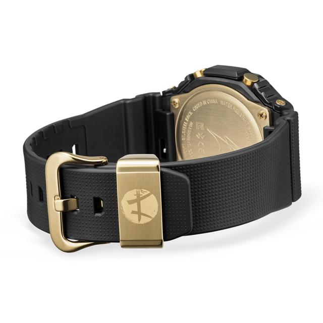 メインカラーをゴールドにし、G-SHOCKのブランドカラーと彼の情熱をあらわすレッドの差し色を加えて、文字板にはバスケットコートをイメージしたパターンをデザインしました。バンドには時計のフェイスを引き立てるブラックを採用し、引き締まった印象を与えています。