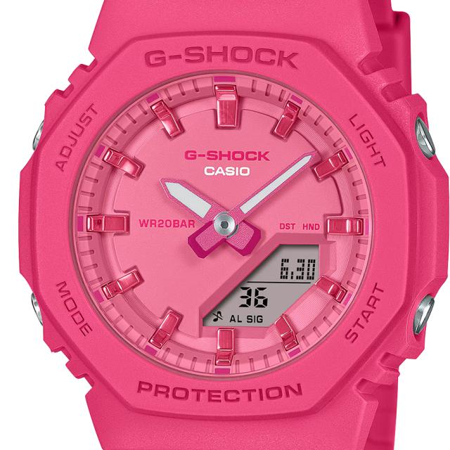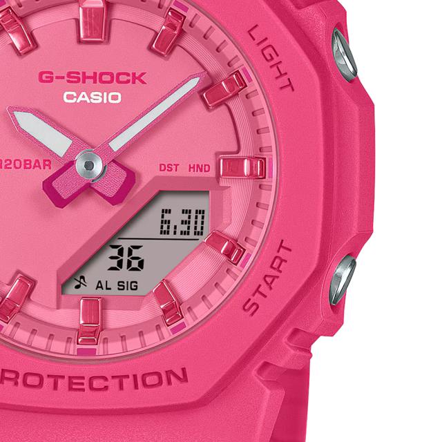 GMA-P2100PPは、八角形ベゼルのスタイリッシュなデザインにニュートラルな色合いのビビッドピンクを採用。針やインデックスをメタリック調に仕上げ、全体をワントーンでまとめました。カジュアルな装いを鮮やかに彩ります。