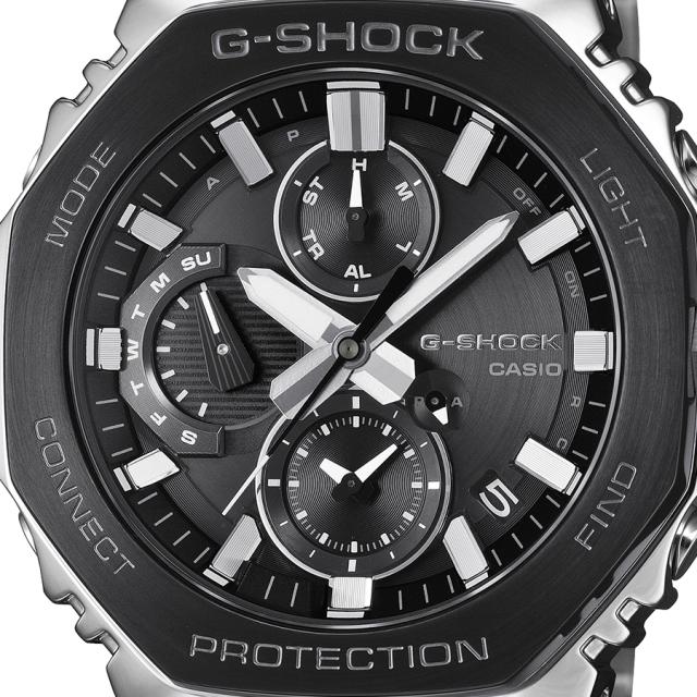 シルバーの中に際立つブラックがG-SHOCKの象徴的な強さを強調しつつ、幅広いスタイルに合わせやすいモノトーンデザインとなっています。