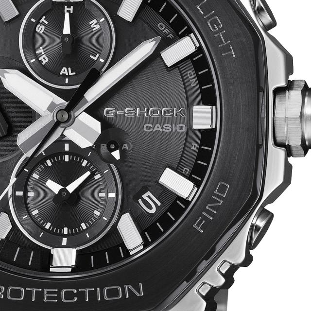 ステンレススチール製のベゼルは、鍛造・切削・研磨といった手間のかかる加工を経て立体的に成形し、美しく仕上げています。フルメタルによる耐衝撃構造を実現するため、ベゼルとケースの間にはファインレジン性の緩衝材を実装。また、メタル製のバンドピースにはディンプル加工を施し、G-SHOCK初号機の樹脂バンドデザインを継承しています。