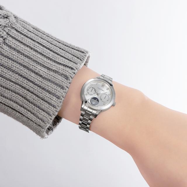 今回の20周年記念モデルは、サン&ムーンを中心に輝く星をイメージしたクリスタルガラスを散りばめたロマンチックなデザインが特長です。星の中でも輝きが強い一番星を12時位置の4粒のクリスタルガラスで表現し、美しさを引き立てています。