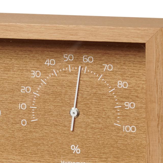 木から四角い塊を切り出してきたような、存在感のある温湿度計です。無垢材を贅沢に使用した時計枠は、植物系のオイル塗装により肌触り良く仕上げられており、木のぬくもりを直に感じて頂くことができます。温湿度計の視認性も考慮し、はっきりとした見やすいデザインです。