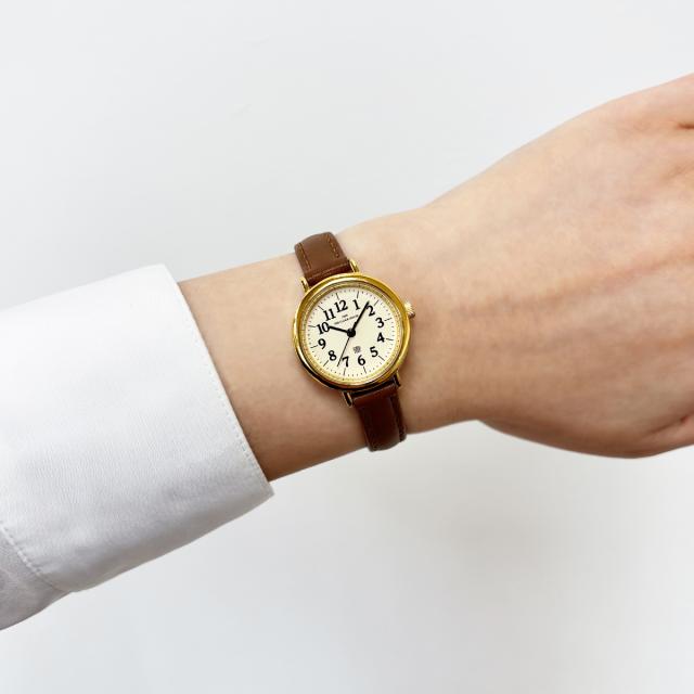 ダイヤルに、視認性に優れたUDフォントを採用。26mmという小ぶりなサイズ感でありながら、数字がはっきりと読み取れるため、腕時計に慣れていない方やファーストウォッチとしても安心してお使いいただけます。やわらかなクリームカラーのダイヤルに、ゴールドカラーのケースとブラウンのレザーストラップを組み合わせることで、温かみと上品さを感じさせるクラシックな印象に仕上げています。